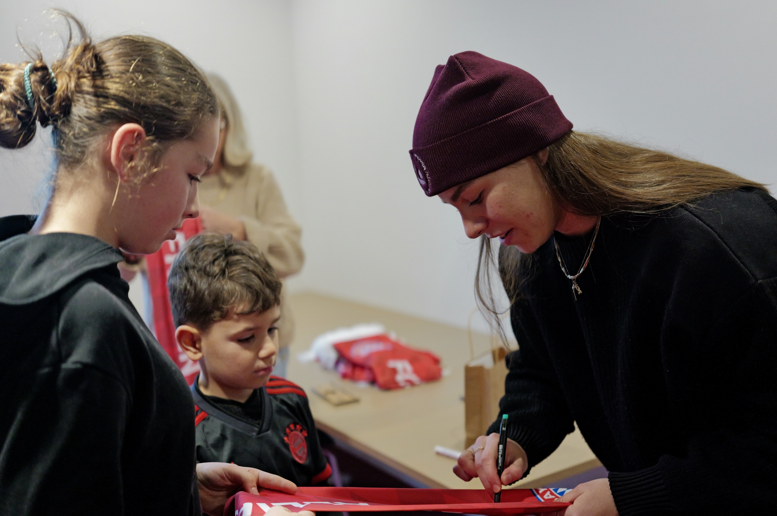 Der Blick hinter die Kulissen des Campus begeisterte die Besucher*innen, doch die größte Überraschung wartete in den Büroräumen: Dort nahm sich Bayern-Star Lena Oberdorf viel Zeit für die jungen Gäste. Die Kinder knipsten Erinnerungsfotos, sammelten fleißig Autogramme und stellten viele Fragen, die ausführlich beantwortet wurden.